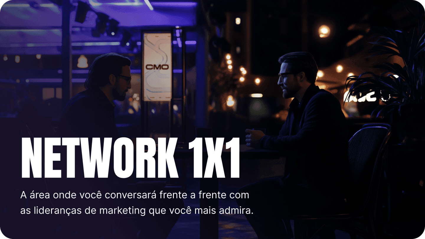Networking seleto com palestrantes, mentores e CMOs convidados em espacos reservados.